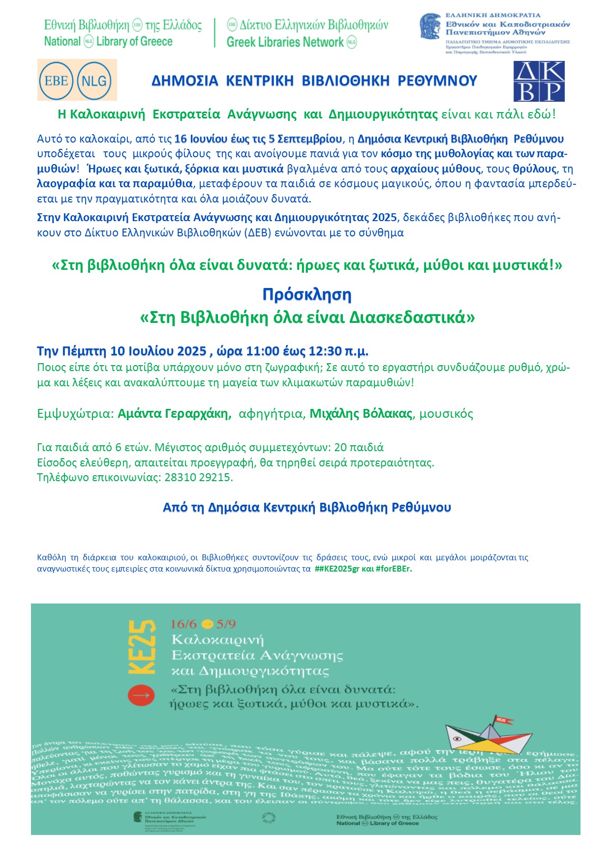 Αυτό το καλοκαίρι, από τις 16 Ιουνίου έως τις 5 Σεπτεμβρίου, η Δημόσια Κεντρική Βιβλιοθήκη Ρεθύμνου υποδέχεται τους μικρούς φίλους της και ανοίγουμε πανιά για τον κόσμο της μυθολογίας και των παραμυθιών! Ήρωες και ξωτικά, ξόρκια και μυστικά βγαλμένα από τους αρχαίους μύθους, τους θρύλους, τη λαογραφία και τα παραμύθια, μεταφέρουν τα παιδιά σε κόσμους μαγικούς, όπου η φαντασία μπερδεύεται με την πραγματικότητα και όλα μοιάζουν δυνατά.