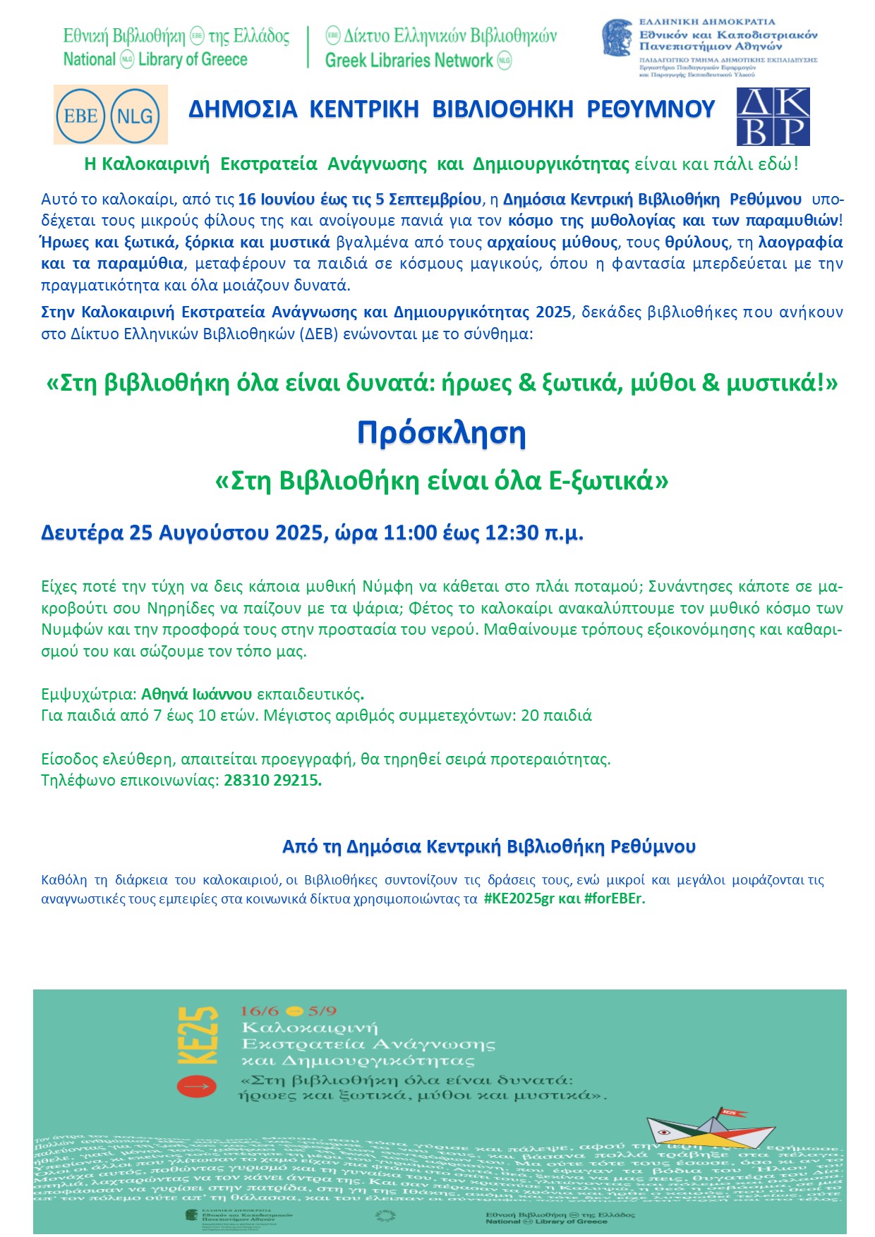 Είχες ποτέ την τύχη να δεις κάποια μυθική Νύμφη να κάθεται στο πλάι ποταμού; Συνάντησες κάποτε σε μακροβούτι σου Νηρηίδες να παίζουν με τα ψάρια; Φέτος το καλοκαίρι ανακαλύπτουμε τον μυθικό κόσμο των Νυμφών και την προσφορά τους στην προστασία του νερού. Μαθαίνουμε τρόπους εξοικονόμησης και καθαρισμού του και σώζουμε τον τόπο μας.